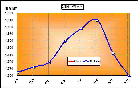 CFR China 1749-1751달러 형성 … 남부유럽 재정위기 확산 우려로 2-EH 가격이 5월27일 CFR China 톤당 1750달러로 전주대비 65달러 폭락했다.아시아 2-EH(Ethylhexanol) 가격은 전주에 95달러 하락한 데 이어 2주 연속 폭락세를 나타냈다. 유럽 재정위기의 미국 확산이 우려됨에 따라 수요자와 거래자들이 앞다투어 거래량을 줄이면서 가파른 폭락장이 연출된 것으로 판단된다. 금융위기에 대한 우려는 금융시장은 물론 원자재 시장에도 폭넓게 나타나 원유가격을 비롯한 석유화학제품의 동반하락으로 이어지고 있다.