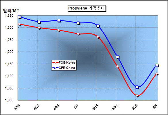 PP(Polypropylene) 가격은 Raffia 그레이드가 CFR China 톤당 1145달러를 형성한 가운데 프로필렌 가격상승으로 PP 마진은 톤당 마이너스 80달러를 기록했다. <오도윤 연구원> 표, 그래프: | Propylene가격추이 | <화학저널 2010/6/8> |