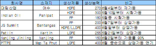 JG Summit는 Batangas 소재 PP 18만톤이 6월7일부터, HDPE와 LLDPE(Linear Low-Density PE) 20만톤은 6월 말부터 상업가동에 돌입할 예정이다.
