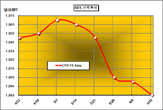 CFR FE Asia 1879-1881달러 형성 … 7-8월까지 하락세 지속될 듯 ABS 가격은 CFR FE Asia 톤당 1881달러로 전주대비 20달러 하락했다.아시아 ABS(Acrylonitrile Butadiene Styrene) 가격은 유럽발 금융위기 확산에 따른 구매심리 위축으로 무역상과 수요처들이 재고 확충에 나서지 않아 하락한 것으로 파악된다. 여기에 원재료인 SM(Styrene Monomer)과 부타디엔(Butadiene) 가격이 계속 약세를 보이고 있는 것도 영향을 미친 것으로 나타났다. 이에 따라 6월 수출물량은 5월과 비교해 30%정도 감소했으며 중국 내수가격 역시 전주대비 40달러 하락해 1856달러를 기록했다.
