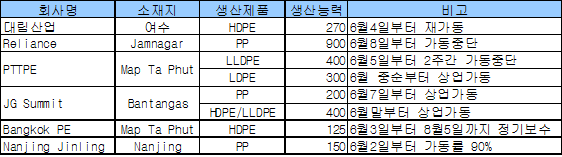 정기보수 마무리 국면에 신규가동까지 … 가동중단은 일시적 아시아 폴리머 가동률이 회복세를 보이며 공급과잉 압박이 심화되고 있다.대림산업은 여수 소재 HDPE(High-Density Polyethylene) 27만톤 플랜트를 6월4일부터 재가동했다. PTTPE는 Map Ta Phut 소재 LDPE(Low-Density PE) 30만톤 플랜트를 6월 중순부터 상업가동할 예정인 반면, LLDPE(Linear LDPE) 40만톤 플랜트는 6월5일부터 2주일 일정으로 가동을 중단하고 있다. JG Summit는 Batangas 소재 PP(Polypropylene) 18만톤을 6월7일부터, HDPE와 LLDPE 20만톤은 6월 말부터 상업가동에 돌입할 예정이다.
