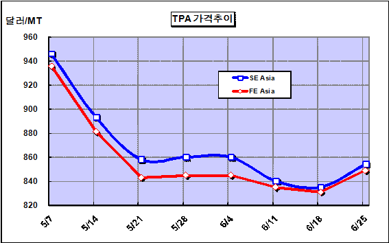 CFR China 853-855달러로 19달러 올라 … 수요부진으로 상승 제한적 PTA(Purified Terephthalic) 가격이 상승세로 반전됐다.PTA 가격은 6월25일 전주대비 19달러 상승하며 CFR China 톤당 853-855달러를 형성했다. 계절적인 영향으로 PTA 수요 감소가 예상됨에도 불구하고 중국의 위안화 절상 영향을 받으면서 상승한 것으로 해석된다. 중화권에서는 위안화 절상 영향을 받아 가격이 상승한 것과는 달리 한국 등에서는 가격상승에 영향을 미치지 않아 톤당 835-840달러를 유지하고 있는 것으로 알려지고 있다. 이에 일부에서는 위안화 절상으로 인한 가격상승이 제한적이라는 의견을 제시하고 있다.