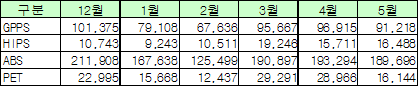 5월 수요감소 영향으로 GPPSㆍABS 줄어들어 … HIPS는 증감 반복 중국의 5월 폴리머(Polymer) 수입이 감소세를 나타냈다.수요 감소는 남유럽의 경기침체 영향과 중국 수요급감에 따른 영향으로 판단되고 있다. GPPS(General Purpose Polystyrene)는 2009년 12월 10만1375톤에서 2010년 1월 7만9108톤, 2월 6만7636톤으로 감소세가 이어졌다. 하지만, 3월 9만5667톤을 기록하며 41.4% 폭증했고, 4월에도 9만6915톤을 나타내며 증가세가 지속됐으나 5월 9만1218톤이 수입되며 5.9% 감소세로 반전됐다. ABS(Acrylonitrile Butadiene Styrene)는 2009년 12월 21만1908톤에서 2010년 1월 16만7638톤, 2월 12만5499톤으로 감소세가 지속됐지만 3월에는 52.1% 늘어난 19만897톤을 기록한 후 4월 역시 19만3294톤을 나타내며 상승세로 전환됐다. 하지만, 5월에는 18만9696톤으로 1.9% 감소했다. PET(Polyethylene Terephthalate)는 2009년 12월 2만2995톤에서 2010년 1월 1만5688톤, 2월 1만2437톤으로 감소했지만 3월에는 2만9291톤으로 135.5% 폭증했으나 4월 2만8966톤, 5월 1만6144톤으로 감소세가 지속되고 있다.