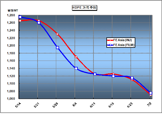 CFR FE Asia 1069-1071달러로 40달러 급락 … 구매수요 실종 HDPE 가격은 6월30일 CFR FE Asia 톤당 1069-1071달러로 40달러 급락했다.아시아 HDPE(High-Density Polyethylene) Injection 그레이드 가격은 공급이 넘치는 와중에서 구매 수요가 거의 없어 다시 급락했다. 그러나 중국에서는 Sinopec이 Injection 그레이드를 ex-works 톤당 9100위안, Blow-Moulding 그레이드는 9100위안으로 높은 가격을 요구하고 있다. Film 그레이드 역시 CFR FE Asia 톤당 1075달러로 45달러 급락했다. 재고가 많은 상태에서 구매 수요가 미미했기 때문으로 당분간 하락세를 면하기 어려울 것으로 예상되고 있다.