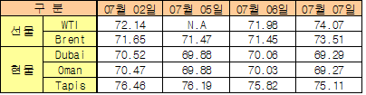 WTI, 7월7일 2.09달러 올라 74.07달러 … 두바이유는 70달러 붕괴 7월7일 국제유가는 미국의 원유 및 휘발유 재고 감소 예상, 열대성 저기압의 멕시코만 내습 가능성, EIA(에너지정보청)의 석유 수요 상향조정 등이 복합적으로 영향을 미쳐 상승했다.한국석유공사에 따르면, 뉴욕상업거래소(NYMEX)의 WTI(서부텍사스 경질유) 선물유가는 74.07달러로 2.09달러, Brent 선물유가는 73.51달러로 2.06달러 올랐다. 반면, 두바이(Dubai)유는 미국의 서비스업 경기지표가 둔화된 영향이 뒤늦게 반영돼 0.77달러 하락한 69.29달러로 70달러가 다시 붕괴됐다.