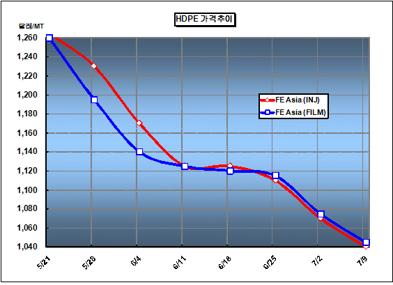 CFR FE Asia 1040달러로 30달러 하락 … 공급과잉 갈수록 심화 HDPE Injection 가격은 7월7일 CFR FE Asia 톤당 1040달러로 30달러 하락했다.아시아 HDPE(High-Density Polyethylene) 시세는 구매수요가 줄어들면서 공급과잉이 심화되고 원료 코스트 하락까지 겹치면서 1000달러대 초반으로 곤두박질쳤다. Injection 그레이드 및 Blow-Molding 그레이드는 전체적으로 다운사이클이 강화되면서 약세를 지속해 1000달러가 무너질 위기에 직면하고 있으며, Sinopec도 9000위안(1328달러)으로 100위안 인하했다.