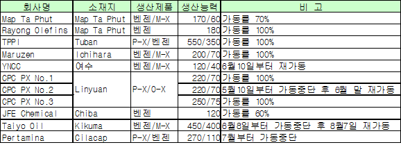 여천NCC는 여수 소재 벤젠 12만톤, M-X 4만톤 플랜트를 6월10일 재가동했으며, Taiyo Oil도 Kikuma 소재 벤젠 45만톤, M-X 40만톤 플랜트를 6월8일부터 가동 중단했으나 8월7일부터 재가동하는 것으로 알려졌다.