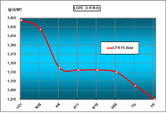 CFR FE Asia 1270달러로 30달러 하락 … 구매수요 약화 지속 LDPE 가격은 7월7일 CFR FE Asia 톤당 1270달러로 30달러 하락했다.아시아 LDPE(Low-Density Polyethylene) 시세는 구매수요 약화에 원료가격의 하락세가 뒤늦게 반영되면서 장기간의 강세를 마무리하고 1300달러가 붕괴됐다. 동남아 가격 역시 CFR SE Asia 톤당 1285달러로 50달러 급락했다.