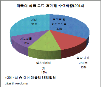 미국에서는 식품 및 음료 첨가제 가운데 감미료 및 화학조미료가 가장 큰 비중을 차지하고 있으며, 2014년에는 매출액이 28억달러로 연평균 2.9%씩 증가할 것으로 전망되고 있다. 여기에 The National Salt Reduction Initiative이 나트륨이 감소된 식품의 맛을 향상시킬 수 있는 화학조미료의 사용량을 늘릴 방침이라고 밝혔다. 설탕 대체 감미료 부문의 매출은 2014년 12억달러로 3.9%씩 증가하고, 다이어트 탄산음료에 사용되는 아스파탐(Aspartame) 수요가 가장 큰 비중을 차지할 것으로 예측되고 있다. 그러나 수크랄로스(Sucralose), 아세설팜칼륨(Acesulfame Potassium) 수요가 아스파탐보다 빠르게 신장할 것으로 판단되고 있어 주목된다. 스테비아(Stevia) 감미료도 2008년 말 FDA(Food & Drug Administration)로부터 식품 첨가제 사용 승인을 받음으로써 수요가 지속적으로 증가할 것으로 보인다. 텍스처라이저(Texturizer) 및 지방 대체재 매출은 6.3%씩 증가해 2014년 11억달러에 달할 것으로 예상되고 있다. 기능식품 수요는 연평균 6.3% 증가율을 보이며 가장 빠르게 신장해 2014년 매출이 8억9000만달러에 달할 전망이다. 기능식품은 주로 빵, 시리얼, 우요, 주스, 요거트에 사용되었으나 최근에는 식탁용 감미료, 초콜렛, 영양스낵바 등으로 활용분야를 확대해 나가고 있기 때문이다. 표, 그래프: | 미국의 식품ㆍ음료첨가제 수요비중(2014) | <화학저널 2010/7/13> |