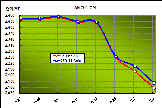 CFR FE Asia 2097-2099달러 형성 … 다운스트림 수요 감소 영향으로 AN(Acrylonitrile) 가격이 하락을 넘어 폭락을 거듭하고 있다.AN 가격은 7월9일 전주대비 82달러 폭락하며 CFR FE Asia 톤당 2097-2099달러를 형성했다. 아시아 AN 가격 하락은 중국의 ABS(Acrylonitrile Butadiene Styrene)와 아크릴섬유(Acrylic Fiber) 등 다운스트림의 수요 감소 영향을 받고 있기 때문이다. 이에 중국기업들은 가격을 낮추고 있으나 거래는 이루어지지 않고 있는 것으로 알려지고 있다.