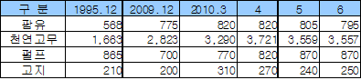 천연고무는 원료 라텍스(Latex) 공급이 타이트해지면서 0.2% 소폭 올라 3557달러로 강보합세를 나타냈다. 펄프는 5월과 같은 870달러로 보합세를, 고지는 중국의 구매 회복으로 4.2% 올라 250달러를 나타냈다. <고우리 기자> 표, 그래프: | 유기ㆍ무기원료 수입가격 변화(2010) | <화학저널 2010/7/20> |