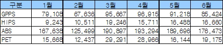 수요 감소 영향 수입량 줄어 … HIPSㆍPET는 소폭 증가 중국의 5월 폴리머(Polymer) 수입이 수요급감 영향으로 약보합세가 지속되고 있다.GPPS(General Purpose Polystyrene)는 2010년 1월 7만9108톤에서 2월 6만7636톤으로 감소세가 이어졌지만 3월 9만5667톤, 4월 9만6915톤을 나타내며 증가세가 이어진 후 5월 9만1218톤으로 감소했고 6월에도 8만5424톤에 그쳤다. ABS(Acrylonitrile Butadiene Styrene)는 2010년 1월 16만7638톤에서, 2월 12만5499톤으로 감소세가 지속됐지만 3월에는 52.1% 늘어난 19만897톤을 기록한 후 4월 역시 19만3294톤을 나타내며 상승세로 전환됐지만, 5월과 6월 각각 18만9696톤과 17만6473톤에 머물렀다.