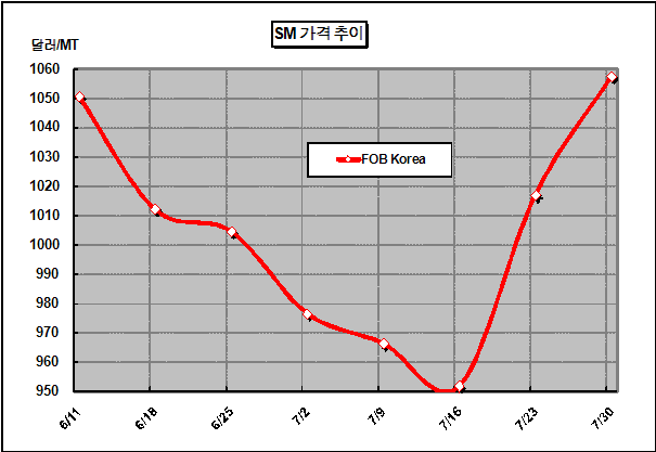 FOB Korea 1058달러로 41달러 올라 … 중국 수요기업 재고 소진 SM 가격은 7월30일 FOB Korea 톤당 1058달러로 41달러 상승했다.아시아 SM(Styrene Monomer) 시세는 원료인 벤젠(Benzene)의 상승세와 중국을 중심으로 SM이 공급부족으로 전환될 것이라는 분석이 제기되면서 2주 연속 급등했다. 중국의 PS(Polystyrene) 및 ABS(Acrylonitrile Butadiene Styrene) 생산기업들이 원료가격 하락세가 지속되자 재고를 거의 소진한 것으로 알려지고 있기 때문이다.
