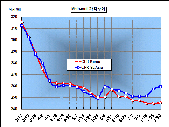 중국의 석탄공법 생산 증가로 … 7월부터 약상승 국면이나 한계 아시아 메탄올(Methanol) 시황이 200달러대 중반에서 정체하고 있다.메탄올 가격은 동남아시아와 중동 플랜트의 트러블 등으로 2010년 3월 초까지 톤당 300달러대를 유지했지만 3월 말 300달러가 붕괴됐다. 국제유가 상승으로 CFR China와 CFR SE Asia 모두 4월 말 일시적으로 290달러를 회복됐지만 4월 초부터는 250-270달러 사이에서 움직이고 있다. 중국의 포르말린(Formalin) 수요가 부진하고 2월 말 DME(Dimethyl Ether)의 위법혼합으로 LPG(액화석유가스) 탱크가 폭발함에 따라 화남지역의 DME 플랜트 가동률이 급속도로 떨어지고, 봄부터 석탄공법 플랜트의 가동률이 높아졌기 때문이다.