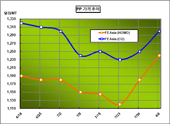 CFR FE Asia 1240달러로 60달러 급등 … 프로필렌 공급부족으로 PP Homo 그레이드 가격은 8월5일 CFR FE Asia 톤당 1240달러로 60달러 급등했다.아시아 PP(Polypropylene) 시세는 국제유가가 배럴당 82달러 수준으로 강세를 보이고 프로필렌(Propylene) 공급부족으로 PP 가동률이 떨어짐에 따라 1200달러를 넘어섰다. 특히, Formosa 플랜트에서 7월7일과 25일 연이어 화재 사고가 발생해 프로필렌 3개 플랜트 총 110만톤이 가동을 중단함으로써 프로필렌 공급부족을 심화시켜 PP 가동률이 떨어지고 PP 수급타이트로 연결되고 있다.