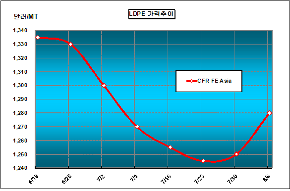 CFR FE Asia 1279-1281달러 형성 … 중동 재고부족으로 구매 난항 LDPE 가격은 8월4일 CFR FE Asia 톤당 1280달러로 30달러 상승했다.아시아 LDPE(Low-Density Polyethylene) 가격은 국제유가가 배럴당 80달러를 돌파하고 에틸렌(Ethylene) 가격 상승 등이 맞물리며 1300달러 돌파를 가시화했다. 여기에 중국의 농업용 필름 수요가 호조를 보이고 있고, 중동기업들이 재고부족으로 Spot 물량 판매에 난항을 겪으면서 LDPE 가격 상승에 호재로 작용했다.