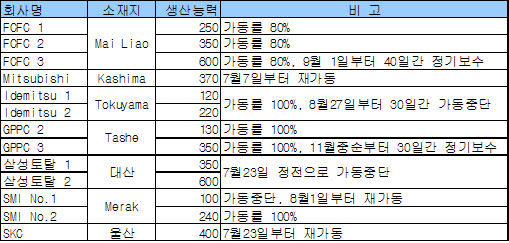 IdemitsuㆍGPPC 풀가동 … 중국 재고 소진으로 공급부족 가능성 아시아의 SM(Styrene Monomer) 가동률이 80%를 기록하며 호조를 보이고 있다.여기에 정기보수 등을 이유로 가동을 중단했던 동아시아 플랜트들이 재가동에 돌입하면서 수급이 완화되고 있다. GPPC의 Tashe 소재 13만톤 및 35만톤, SMI의 Merak 소재 No.2 24만톤 플랜트는 풀가동되고 있다. Idemitsu Petrochemical는 Tokuyama 소재 12만톤 및 22만톤 플랜트를 100% 가동하고 있고, FCFC는 Mai Liao 소재 25만톤 및 35만톤 플랜트의 가동률을 80%로 유지하고 있다. Mitsubishi Chemical은 Kashima 소재 37만톤 플랜트를 7월7일부터, SKC는 울산 소재 40만톤 플랜트를 7월23일부터 재가동했다.
