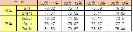 WTI, 8월16일 0.15달러 내려 75.24달러 형성 … 두바이유도 하락 8월16일 국제유가는 주요국의 경기지표 부진에 따른 경기회복 둔화 우려가 확산됨에 따라 하락했다.한국석유공사에 따르면, 뉴욕상업거래소(NYMEX)의 WTI(서부텍사스 경질유) 선물유가는 75.24달러로 0.15달러, Brent 선물유가는 74.85달러로 0.26달러 내렸다. 두바이(Dubai)유도 미미국의 소매판매 부진 등에 따른 경기회복 둔화 우려가 뒤늦게 반영돼 0.64달러 하락한 72.50달러에 마감했다.