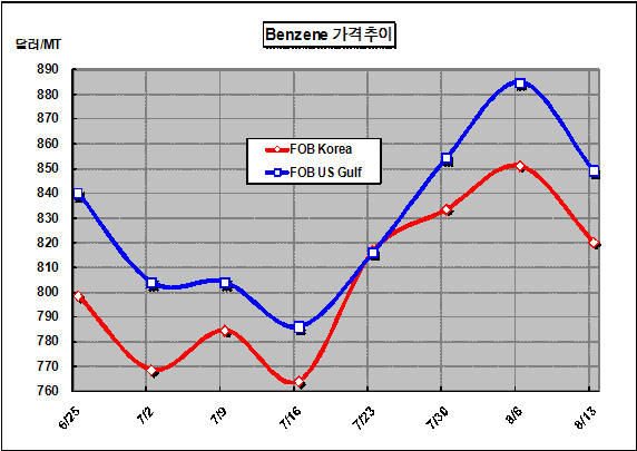 FOB Korea 820달러로 31달러 하락 … 미국가격도 849달러로 약세 벤젠 가격은 8월13일 FOB Korea 톤당 820달러로 31달러 하락했다.아시아 벤젠(Benzene) 시세는 국제유가가 배럴당 76-77달러 수준으로 급락한 상태에서 미국가격까지 급락함에 따라 800달러대 초반으로 떨어졌다. 미국의 벤젠 가격은 갤런당 282.95-283.00센트로 톤당 849달러를 형성해 전주에 비해 36달러 하락했다.