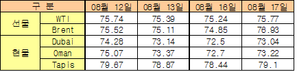 WTI, 8월17일 75.77달러로 0.54달러 상승 반전 … 두바이유도 올라 8월17일 국제유가는 미국의 산업생산 증가에 따른 증시 호조., 달러화 약세,원유 재고 감소전망 등이 복합적으로 작용해 상승했다.한국석유공사에 따르면, 뉴욕상업거래소(NYMEX)의 WTI(서부텍사스 경질유) 선물유가는 75.77달러로 0.53달러, Brent 선물유가는 76.93달러로 1.30달러 올랐다. 두바이(Dubai)유 현물유가도 전일대비 0.54달러 오른 73.04달러에 마감했다.