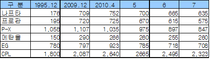 표, 그래프: | 석유화학제품의 수입가격 변화(2010.7) | <화학저널 2010/8/18> |