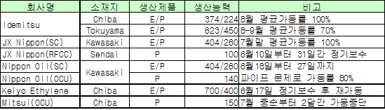 Nippon Oil, 파이프 문제로 6월 80% … Mitsui는 OCU 가동중단 일본은 올레핀 가동률이 불안정한 행보를 보이고 있다.Idemitsu Petrochemical은 Chiba 소재 에틸렌(Ethylene) 37만4000톤 크래커를 8월 평균 100% 가동하고 있으며, Tokuyama 소재 에틸렌 62만3000톤 크래커는 8-9월 평균 70% 가동할 계획이다. 반면, JX Nippon는 Kawasaki 소재 에틸렌 40만4000톤 크래커를 풀가동하고 있다. 또 Sendai 소재 RFCC 프로필렌(Propylene) 10만톤 플랜트는 6월10일부터 7월10일까지 31일간 정기보수를 마치고 재가동에 돌입한 것으로 알려졌다.