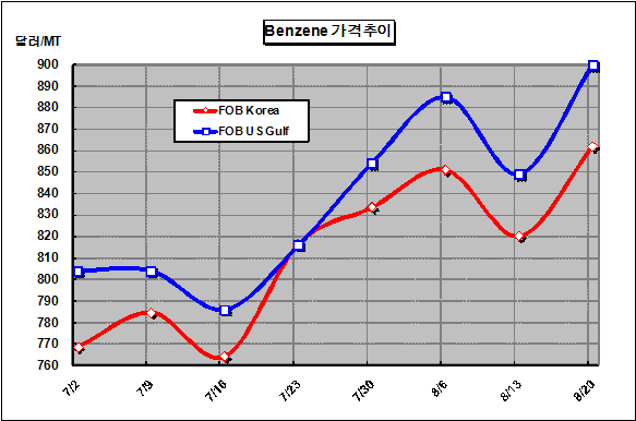 FOB Korea 862달러로 42달러 상승 … 미국가격은 900달러 수준 벤젠 가격은 8월19일 FOB Korea 톤당 862달러로 42달러 상승했다.아시아 벤젠(Benzene) 시세는 국제유가가 74달러 수준으로 폭락했음에도 불구하고 미국가격이 크게 상승한 영향을 받아 다시 상승세로 전환됐다. 국제유가는 WTI(서부텍사스 경질유) 기준 배럴당 74.53달러로 하락했으나, 미국의 벤젠 가격은 갤런당 300센트 수준으로 톤당 900달러를 형성해 51달러 급등했다.