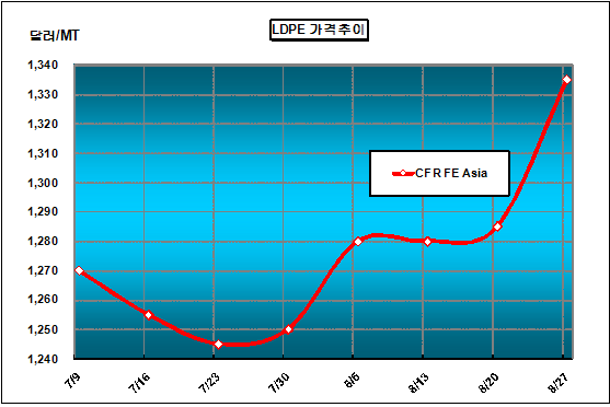 CFR FE Asia 1335달러로 50달러 상승 … 원료코스트도 강세 LDPE 가격은 8월25일 CFR FE Asia 톤당 1335달러로 50달러 급등했다.아시아 LDPE(Low-Density Polyethylene) 시세는 계속적인 원료코스트 상승과 함께 중국을 중심으로 동북아시아의 수급이 타이트해짐에 따라 단숨에 1300달러를 돌파했다. 아시아 LDPE 시장은 동남아시아와 중동의 가동률이 낮은 수준을 보이고 있는 가운데 9월 최종 수요처의 구매수요가 증가하고 있어 당분간은 강세를 지속할 것으로 예상되고 있다.