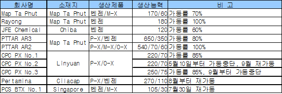 PTTAR· Rayoung 100% 가동 … 가동률 높고 재가동도 이어져 아시아 BTX 가동률이 80% 이상을 상회하며 호조를 보이고 있다.여기에 8-9월부터 가동을 중단했던 일부 플랜트가 재가동에 돌입할 것으로 알려져 수급에 문제가 발생할 가능성이 우려되고 있다. 타이의 PTTAR은 Map Ta Phut 소재 No.2 P-X(Para-Xylene) 54만톤 및 M-X(Mixed Xylene) 7만톤 플랜트를, Rayong Olefins은 Map Ta Phut 소재 벤젠(Benzene) 18만톤 플랜트를 100% 가동하고 있다. 타이완의 CPC PX도 Linyuan 소재 No.1 P-X 22만톤 및 벤젠 7만톤 플랜트를 85% 가동하고 있으며, 타이의 Map Ta Phut Olefins은 Map Ta Phut 소재 벤젠 17만톤, M-X 6만톤 플랜트를 70% 수준으로 가동하고 있다.