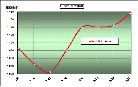 CFR FE Asia 1175달러로 30달러 상승 … 중국 내수가격은 1만위안 형성 LLDPE 가격은 8월25일 CFR FE Asia 톤당 1175달러로 30달러 상승했다.아시아 LLDPE(Linear Low-Density Polyethylene) 시세는 수요가 정체되는 4/4분기를 앞두고 있음에도 불구하고 원료코스트가 상승해 강세를 지속하고 있다.