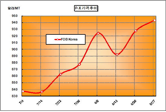 FOB Korea 944달러로 16달러 상승 … KP케미칼은 815달러 거래 P-X 가격은 8월27일 FOB Korea 톤당 944달러로 16달러 상승했다.아시아 P-X(Para-Xylene) 시세는 국제유가가 배럴당 74-75달러로 약세를 보였음에도 나프타(Naphtha) 가격이 CFR Japan 톤당 667달러로 강세를 지속함에 따라 약상승했다. 그러나 KP케미칼은 10월 공급물량 5000톤을 CFR Taiwan 톤당 815달러에, SK에너지에게는 811달러에 판매한 것으로 알려졌다.