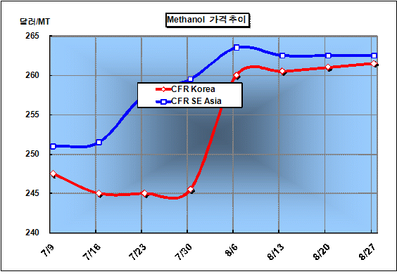 동남아ㆍ중동 잇따른 트러블도 무위 … 이란 금융제재는 문제 아시아 메탄올(Methanol) 가격이 횡보를 지속하고 있다.CFR China는 일시적으로 톤당 240달러로 하락했으나 최근 2-3주 동안 반등해 8월 셋째 주에는 270-280달러 전후를 형성했으나 8월 말 260달러대로 하락했다. 아시아 메탄올 가격은 3월 300달러가 붕괴됐고 5월 초부터 250달러 수준을 유지하는 등 곤혹을 치루었으나 6월부터는 260달러 안팎에서 등락하고 있다. CFR China는 포르말린(Formalin) 수요가 부진하고 DME(Dimethyl Ether) 플랜트의 저가동이 이어지는 가운데 7월 중순 240달러 이하로 하락했으나 7월 말 270-280달러대로 상승했다.