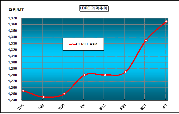CFR FE Asia 1365달러로 30달러 상승 … 동아시아 공급부족도 지속 LDPE 가격은 9월1일 CFR FE Asia 톤당 1365달러로 30달러 상승했다.아시아 LDPE(Low-Density Polyethylene) 시세는 원료코스트가 상승한 상태에서 동아시아의 공급부족이 지속돼 4주 연속 상승했다. 특히, 사우디에서는 CFR China 톤당 1370달러를 요구했으나 지나치게 높은 수준이어서 거래가 이루어지지는 않은 것으로 알려졌다.