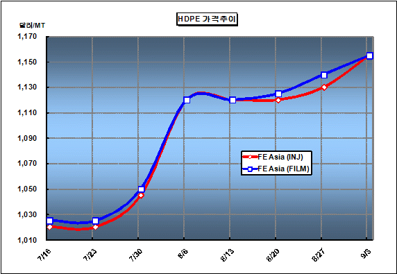 CFR FE Asia 1155달러로 25달러 상승 … 원료코스트도 부담 HDPE Injection 그레이드 가격은 9월1일 CFR FE Asia 톤당 1155달러로 25달러 상승했다.아시아 HDPE(High-Density Polyethylene) 시세는 원료코스트가 강세를 보이고 있고 중국을 중심으로 수급이 타이트해짐에 따라 2주 연속 오름세를 나타냈다. Injection 및 Blow-Molding 그레이드는 사우디의 공급량이 줄어들어 강세를 지속하고 있고, Film 그레이드 역시 공급부족으로 거래가 줄어들면서 1155달러로 20달러 상승했다.