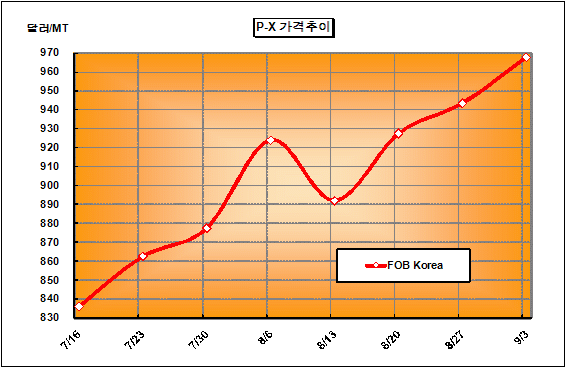 FOB Korea 968달러로 24달러 올라 … 공급증가로 추가상승은 난망 P-X 가격은 9월3일 FOB Korea 톤당 968달러로 24달러 상승했다.아시아 P-X(Para-Xylene) 시세는 4/4분기부터 수급이 타이트해질 것으로 예상되면서 재고를 보충하기 위한 구매수요가 증가해 3주 연속 상승했다. 중국에서 폴리에스터(Polyester) 가동률이 높아질 것으로 보여 PTA(Purified Terephthalic Acid) 제조용 수요증가가 확실시되고 있기 때문이다.