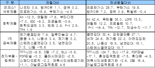 화학제품은 AN이 12.3% 떨어진 것을 비롯해 에틸렌(Ethylene) 7.6%, 부타디엔(Butadiene) 7.0%, EDC (Ethylene Dichloride) 6.2%, 프로필렌(Propylene) 3.6% 하락했으나 벤젠(Benzene)과 P-X(Para-Xylene) 등 BTX는 상승했다. 1차금속제품은 전기용접강관 및 알루미늄괴, 동봉, 나동선, 플래시메모리 등이 하락한 반면, 아날로그 직접회로는 상승한 것으로 나타났다. <고우리 기자> 표, 그래프: | 공산품의 생산자물가 변화(2010.8)(단위: %) | <화학저널 2010/9/10> |