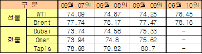 두바이(Dubai)유 현물시세는 싱가폴 공휴일(Hari Raya Puasa: 라마단 축제일)로 입전되지 않았다.