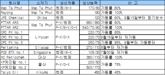 가동률 높고 정기보수 없어 … SK케미칼과 Taiyo Oil은 부진 아시아 BTX 가동률이 호조를 보이는 가운데 정기보수가 저조해 공급과잉 가능성이 높아지고 있다.HC Petrochem은 대산 소재 P-X(Para-Xylene) 38만톤, 벤젠(Benzene) 11만톤 플랜트를, PTTAR은 Map Ta Phut 소재 AR2 P-X 54만톤, M-X(Mixed Xylene) 7만톤 플랜트를 풀가동하고 있다. Rayong는 Map Ta Phut 소재 벤젠 18만톤 플랜트를 100% 가동하고 있으며 CPC PX도 Linyuan 소재 No.1 P-X 22만톤, 벤젠 7만톤 플랜트를 85% 가동하고 있다. Map Ta Phut는 Map Ta Phut 소재 벤젠 17만톤 M-X 6만톤 플랜트의 가동률을 80%로 유지하고 있다.