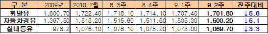 석유공사, 5.6원 내려 1701.8원 … 자동차 경유는 1500.2원 휘발유 공급가격은 8월 말까지 약세를 지속한 국제가격의 영향을 받아 3주 연속 하락했다.석유공사 석유정보시스템 오피넷에 따르면, 2010년 9월 둘째 주 주유소의 휘발유 판매가격은 리터당 1701.8원으로 전주대비 5.6원 하락했다.