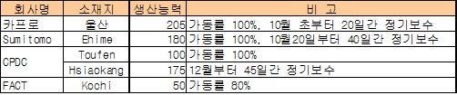 카프로ㆍSumitomoㆍCPDC 정기보수로 … 9월에는 가동률 양호 CPL(Caprolactam)은 9월 가동률 호조를 나타내고 있다.카프로와 Sumitomo는 각각 울산 소재 20만5000톤 플랜트와 Ehime 소재 18만톤 플랜트를 풀가동하고 있다. CPDC 역시 Toufen 소재 10만톤 플랜트의 가동률을 100%로 유지하고 있으며, FACT는 Kochi 소재 5만톤 플랜트를 80% 가동하고 있다.