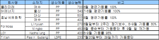 폴리미래ㆍ호남ㆍSK 가동률 양호 … Formosa는 27만톤 정기보수 아시아의 폴리머 공급과잉 우려가 확산되는 가운데 국내 PP(Polypropylene) 플랜트의 가동률이 100%를 기록하고 있다.폴리미래는 여수 소재 PP 70만톤 플랜트의 7월 평균가동률이 100%를 기록했으며, SK에너지의 울산 소재 PP 34만톤 플랜트 역시 6, 7월 풀가동한 것으로 나타났다. 호남석유화학은 대산 소재 PP 50만톤과 여수 소재 40만톤 플랜트를 모두 풀가동하고 있는 것으로 알려졌다.