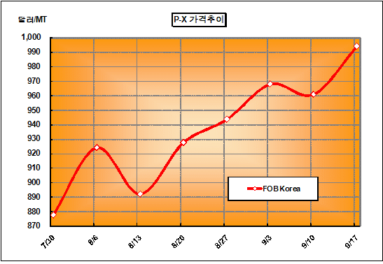 한편, 타이완의 CPC는 M-X(Mixed-Xylene) 1만5000톤을 구매한 반면, SK에너지는 1만톤과 5000톤을 수출한 것으로 알려졌다. 표, 그래프: | P-X가격추이 | <화학저널 2010/9/20> |