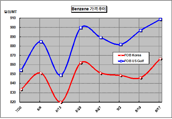 FOB Korea 867달러로 21달러 올라 … 일본 12만톤 정기보수도 영향 벤젠 가격은 9월17일 FOB Korea 톤당 867달러로 21달러 상승했다.아시아 벤젠(Benzene) 시세는 최대 유도제품인 SM(Styrene Monomer) 제조용 수요가 증가하면서 수급타이트로 전환돼 상승세를 나타냈다. 동남아시아에서도 벤젠 가격이 상승함에 따라 타이의 PTT Aromatics & Refining이 10월 말 3000톤을 Spot 공급할 것으로 알려졌다.