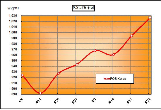 FOB Korea 1026달러로 32달러 올라 … 10월 ACP 1080달러 P-X 가격은 9월24일 FOB Korea 톤당 1026달러로 32달러 상승했다.아시아 P-X(Para-Xylene) 시세는 특별한 상승요인이 없는 가운데 미국의 이란제재로 수급이 타이트할 것으로 예상되면서 1000달러를 돌파했다. 다만, 한국, 일본, 중국 모두 수요가 크지 않아 상승세를 지속하기는 어려울 것으로 예상되고 있다.