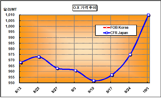 FOB Korea 1010달러로 34달러 상승 … M-X와의 스프레드는 축소 O-X 가격이 9월 이후 가파른 상승곡선을 그리고 있다.아시아 O-X(Ortho-Xylene) 가격은 FOB Korea 톤당 1010달러로 전주대비 34달러 상승하며 1000달러를 돌파했다. 추석연휴로 국내기업들의 공급이 감소하고, 다운스트림인 PA(Phthalic Anhydride) 수요가 호조를 보임에 다라 강세를 이어간 것으로 판단된다. 원료인 Isomer 그레이드 M-X(Mixed Xylene) 가격 역시 FOB Korea 933달러로 16달러 상승해 O-X 가격상승을 부채질했다.
