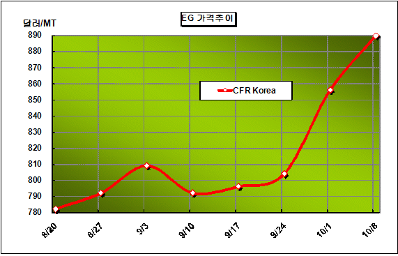 CFR China 890달러로 34달러 상승 … 공급중단으로 수급 타이트 MEG 가격은 10월8일 CFR China 톤당 890달러로 34달러 상승했다.아시아 MEG(Monoethylene Glycol) 시세는 중국의 장기연휴로 거래가 거의 중단됨으로써 오히려 수급타이트를 유발해 900달러에 육박했다. 중국의 폴리에스터(Polyester) 생산기업들이 구매에 나섰으나 공급이 거의 중단됐기 때문이다.