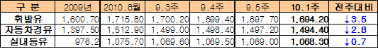 석유공사, 3.5원 내려 1694.2원 … 국제유가 타고 상승 전환 예상 휘발유 공급가격은 9월 말까지 보합세를 나타낸 국제가격의 영향으로 5주 연속 하락하며 1600원대 후반에서 머물고 있다.석유공사 석유정보시스템 오피넷에 따르면, 2010년 10월 첫째 주 주유소의 휘발유 판매가격은 리터당 1694.2원으로 전주대비 3.5원 하락했다.