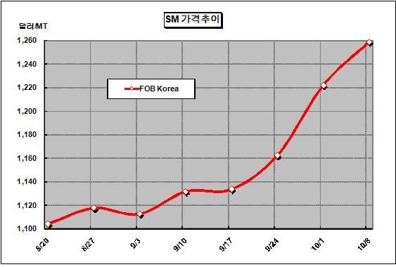 FOB Korea 1259달러로 37달러 상승 … 벤젠과의 스프레드 336달러 SM 가격은 10월8일 FOB Korea 톤당 1259달러로 37달러 상승했다.아시아 SM(Styrene Monomer) 시세는 국제유가가 초강세를 보이고 원료코스트까지 상승세를 지속한 영향을 받아 1200달러대 후반으로 올라섰다. 국제유가가 Brent유 기준 84달러를 넘어서고, 원료 벤젠(Benzene) 가격도 FOB Korea 톤당 923달러로 20달러 상승했기 때문이다.