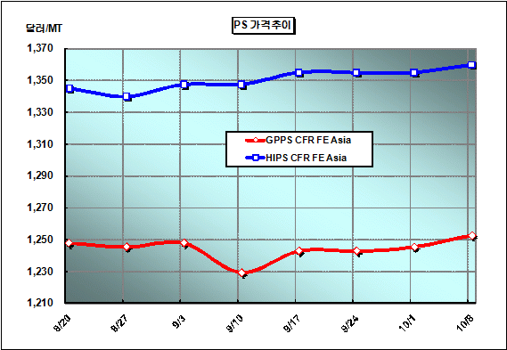 CFR China 1252-1253달러 형성 … 스프레드 마이너스 반전으로 비상 GPPS 가격은 10월6일 CFR China 톤당 1253달러로 8달러 상승했다.아시아 GPPS(General Purpose Polystyrene) 가격은 원료 SM(Styrene Monomer) 가격 급등에도 불구하고 상승세가 제한됐다. 특히, SM 가격이 전주대비 44달러 상승해 CFR 1260달러를 기록함으로써 SM과 GPPS의 스프레드가 마이너스로 전환됐으며, PS 생산기업들은 가동률 조정 등의 대책 마련을 서두르고 있다. 여기에 10월 1-7일 중국의 국경절 연휴가 겹치면서 거래가 제한돼 인디아, 동남아 플랜트들은 잇따라 가동률을 50-80% 수준으로 하향 조정하고 있는 것으로 알려졌다.