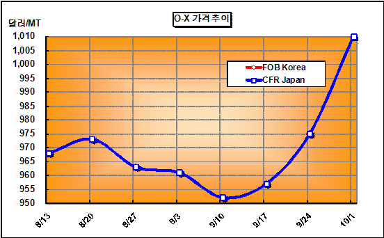 FOB Korea 1044-1046달러 형성 … isomer M-X도 40달러 상승 O-X 가격이 수직상승을 이어가고 있다.아시아 O-X(Ortho-Xylene) 가격은 FOB Korea 톤당 1045달러로 전주대비 35달러 상승해 9월10일 이후 상승세를 이어갔다. 중국 국경절 연휴로 10월 1-7일 중국의 Spot 거래가 중단됐음에도 불구하고 타이완과 한국 사이에 거래가 이어졌고, 원료 가격도 강세를 보였기 때문이다.